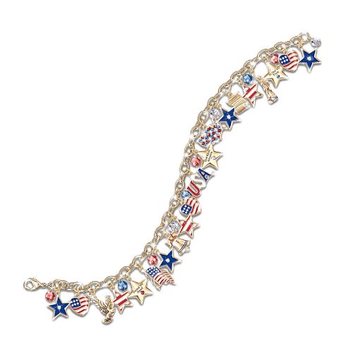 American Patriotic Charm Bracelet Jewelry! 20 Flag-waving Charms with Swarovski(R) Crystals, Vivid Enameling and Engraving - As the ultimate patriot, you're proud to show the world how you feel about the U.S.A! Now, beautiful American patriotic charm bracelet jewelry helps you express your devotion to the Stars and Stripes, the Liberty Bell, Statue of Liberty and more! This handcrafted charm bracelet boasts a total of 20 patriotic symbol charms, plated in 24K gold and gleaming with accents of red, white and blue enamel and genuine Swarovski(R) crystals.Enjoy a star-spangled celebration with this engraved sterling silver charm bracelet, a fine jewelry design available exclusively from The Bradford Exchange. The three engraved charms convey the patriotic messages "United We Stand," "God Bless America" and "In God We Trust." Powerful demand is expected for this patriotic symbols gift, and you won't want to miss out.