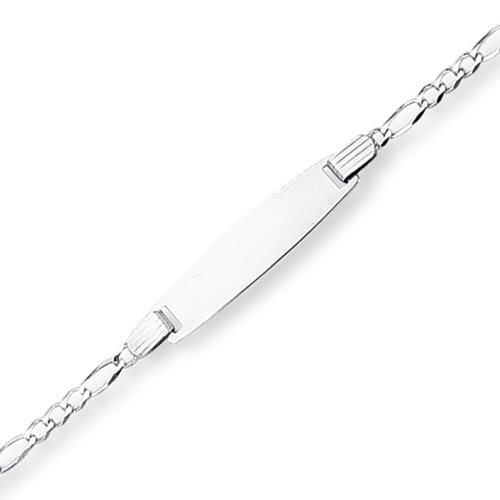 This is an adorable child's ID bracelet in gleaming 14k white gold. The brightly polished ID tab is linked to a Figaro link chain and is engravable making it more personal. This 6" ID bracelet comes with free engraving in a complimentary gift box..