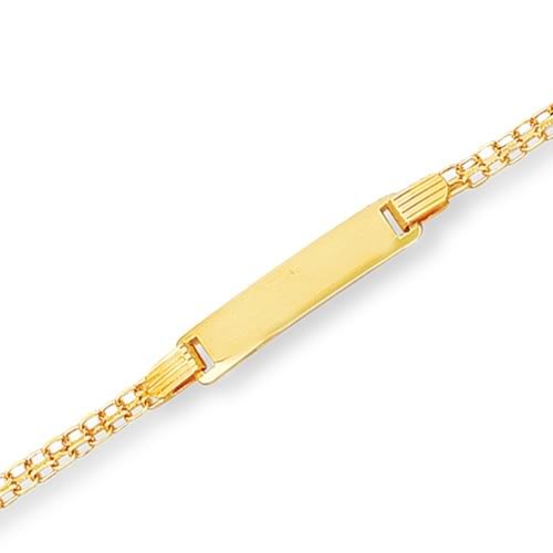 This is an adorable child's ID bracelet in gleaming 14k yellow gold. The brightly polished ID tab is linked to a Oval rolo link chain and is engravable making it more personal. This 6" ID bracelet comes with free engraving in a complimentary gift box.